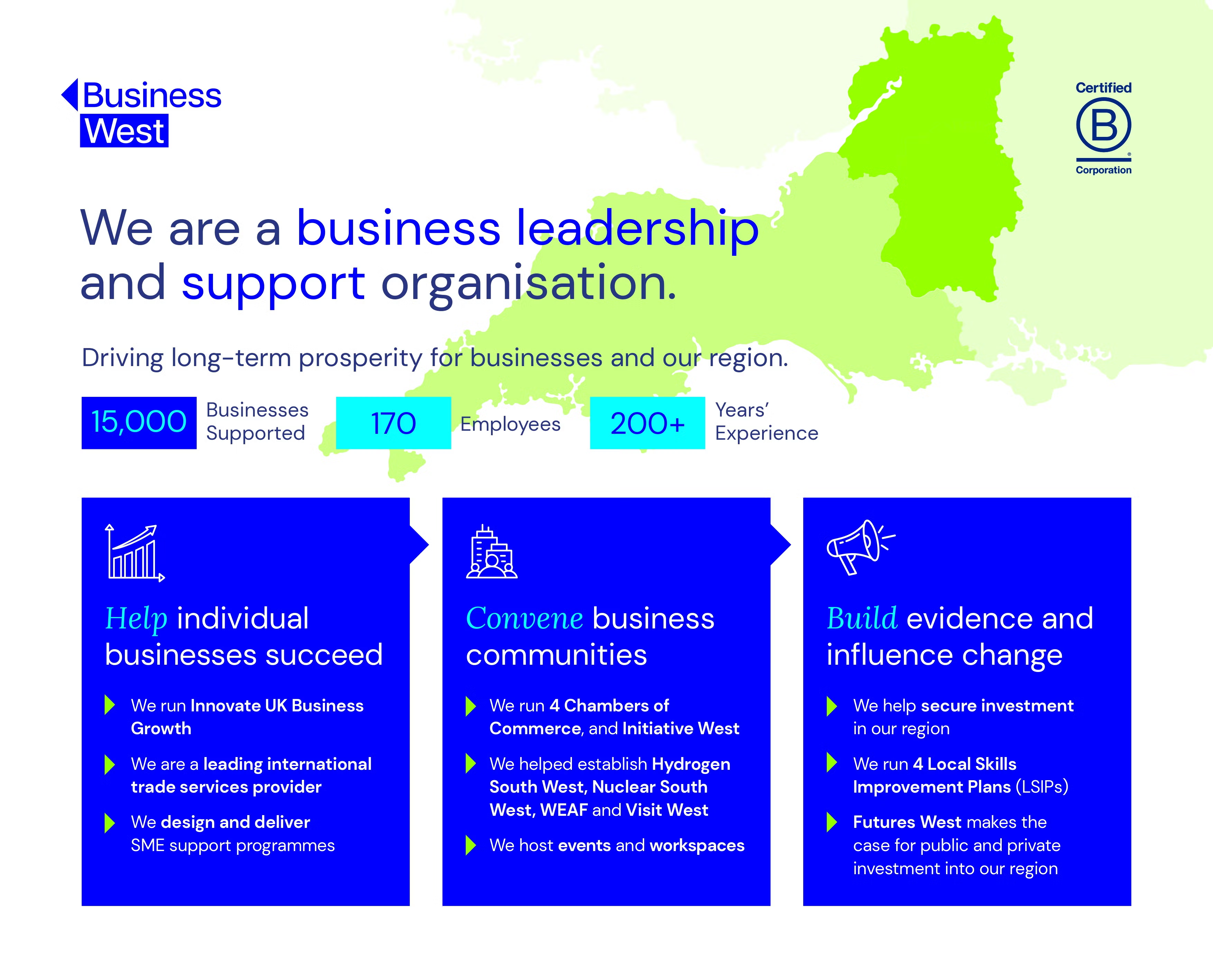 Business West is a business leadership and support organisation, driving long-term prosperity for businesses and our region. We help individual businesses succeed, and we convene communities, build evidence, and influence change.